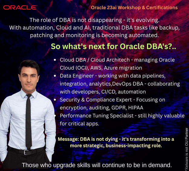 The role of DBA is not disappearing – It’s evolving.With automation, Cloud and AI traditional DBA tasks like backup, patching and monitoring is becoming automation